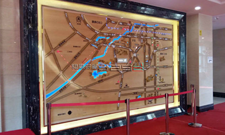 项目名称:涿州香邑溪谷区位模型尺寸:570*360CM项目简介:本区位沙盘使用黑色亚克力为主要材质,使用黄色系灯光为主色调,使用镶嵌式安装方式,沙盘与周围环境相协调。【梅州模型公司】银河集团直营 专